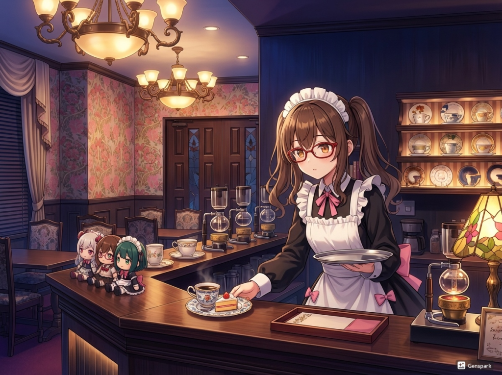 プロンプトは「1枚目の画像のカウンターの内側で2枚目のメイド少女が料理を出している」です。