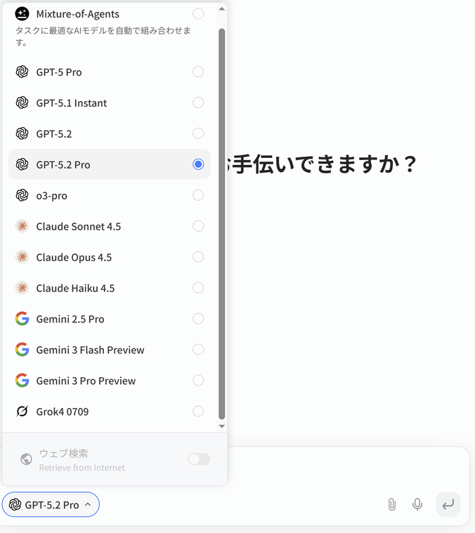 各社のAIが使えるようになっています、今だとGPT-5.2 Pro、Gemini 3 Pro Previre、Grok4も選択できます。複数のLLMを比較できるのが良いですね。